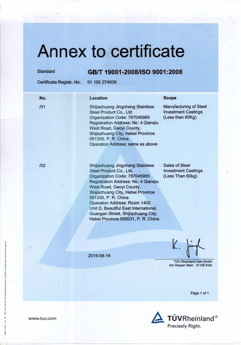 Shijiazhuang Jingcheng Stainless Steel Products Co., Ltd. is a professional precision casting enterprise. It mainly produces precision castings and processed products of stainless steel, alloy steel, low carbon steel and various special alloy materials.